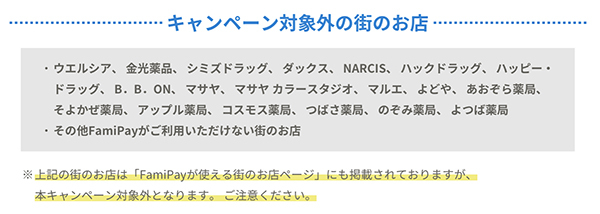 キャンペーン期間中、FamiPay利用額税込200円につき1FamiPayボーナス+39期間限定FamiPayボーナスで計40円相当が戻ってくる。条件はキャンペーン終了までに、銀行口座またはファミマTカード(クレジットカード)を登録すること。ファミリーマート店頭アプリでは、公共料金、各種代金払い、FamiPay請求書払い、お試しクーポン利用時のFamiPay払いは対象外。また、街のFamiPayが使える店のうち、ウエルシア、ダックス、マサヤなど一部店舗は対象外となる。キャンペーンによる期間限定FamiPayボーナス付与上限は期間中1950円相当。