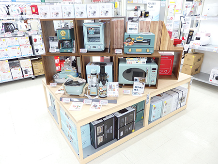 他にもキッチン家電のコーナーでは、レトロ感のあるラドンナやおしゃれなブルーノの商品を、専用の棚を大胆に斜めにレイアウトして立体的に展示している。画一的な什器に商品を整然と並べるだけでなく、スペースや空間を上手に利用することで、ワンポイントで目に留まるような仕掛けが生まれる。