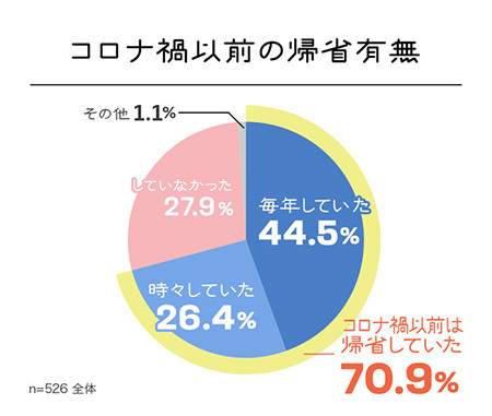 親と離れて暮らす人に聞いた結果、コロナ禍で親と実際に会う頻度が「とても減った」が50.0%、「やや減った」が20.9%と、約7割が減少したことがわかった。また、今年のお盆の帰省について質問したところ、「帰省しない」が58.6%、「検討中」が21.3%と、約8割が帰省しない決断をしたか、お盆まで1カ月を切るタイミングになっても帰省について悩んでおり、まだまだ帰省しにくい日々が続いている様子が見て取れる。なお、コロナ禍以前はお盆の帰省を「毎年していた」が44.5%、「ときどきしていた」が26.4%と、約7割の人が帰省していたことからも、コロナ禍で親と会う機会が激減していることがわかる。