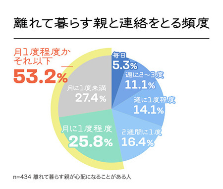 会えない日々が続く状況下で、離れて暮らす親について心配・気がかりになることが「ある」人は82.5%と8割を超え、親が一人暮らしの人に限定すると90.3%にものぼった。一方で、心配・気がかりになることが「ある」と答えた人に親との連絡頻度を聞いたところ、「月に1度未満」「月に1度程度」が過半数となり、心配ではあるものの頻繁に連絡が取れない、または取りにくいこともわかった。