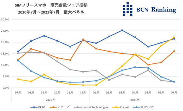 市場が落ち込むなか、Xiaomi・OPPO・シャープが販売台数を伸ばしており、7月は3社で60%近くのシェアを占めた。特に成長著しいのがXiaomiだ。年初から右肩上がりに支持を拡大しており、7月の販売台数は前年同月比467.7%。日本市場参入以来初となる月間販売台数シェア1位を獲得した。