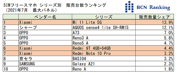 シリーズ別の販売台数ランキングのトップは、Xiaomiの「Mi 11 Lite 5G」。同社は「Redmi 9T 4GB+64GB」が7位、「Redmi Note 10 Pro」が8位にランクインしている。1.8ポイント差で2位につけているのがシャープの「AQUOS sense4 lite」。メーカーシェアで競っているOPPOは「A73」が3位、ほか3製品がベストテン入りしている。(BCN・大蔵 大輔)