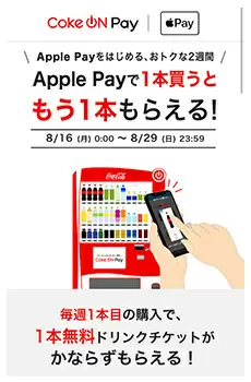 そのCoke ON PayにAppleのウォレットサービス「Apple Pay」も対応。8月16日から2週間の期間限定で、「おトクな2週間でApple Payを始めよう!Apple Payで1本買うともう1本もらえるキャンペーン」を実施している。1週目は終了したが、8月29日23時59分までの2週目はまだ間に合う。