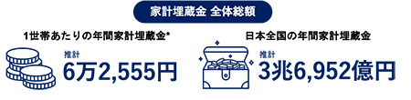 ソニー損害保険(ソニー損保)は、コロナ禍などの影響により夏のボーナスが3年連続の減少となったことを踏まえ、全国の1000世帯を対象に家計の固定費の実態とその節約の可能性について調査。その結果、日本全国の“家計埋蔵金”総額は、年間で推計3兆6952億円(1世帯あたり年間6万2555円)にものぼる可能性があることがわかった。これは、大阪府の年間予算3兆7275億円に迫る規模となる。