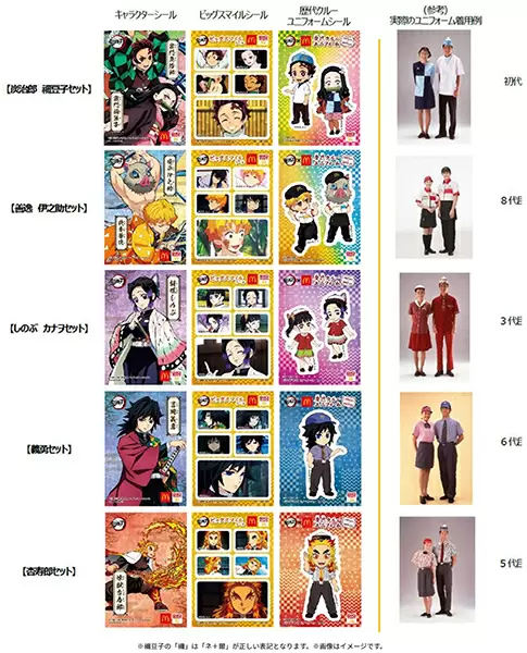 日本マクドナルドが50周年を迎えたことにちなんで、炭治郎たちが歴代のクルーユニフォームを着た、限定の描き下ろしシールも登場する。炭治郎と禰豆子は初代(1971年~1979年)、しのぶとカナヲは3代目(1983年~1987年)、杏寿郎は5代目(1991年~1996年)、義勇は6代目(1996年~2004年)、善逸と伊之助は8代目(2007年~2013年)のユニフォームを着用している。