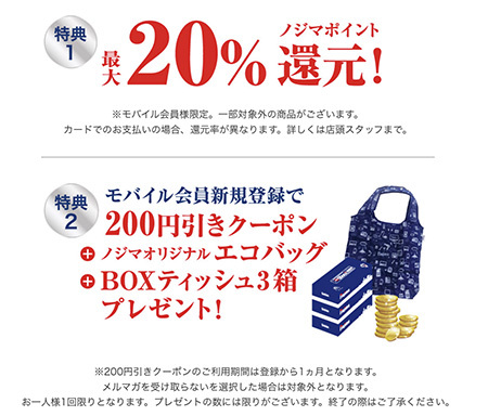 混雑緩和と接客の効率化のため、オープンセール終了後から、他店でも実施している店員を呼ぶ「自動発券機」を試験導入する予定。オープンセールでは、モバイル会員限定で、一部商品を除き、ノジマポイントを最大20%還元するほか、モバイル会員新規登録で「200円オフクーポン」「ノジマオリジナルエコバック」「BOXティッシュ3箱」をプレゼントする。