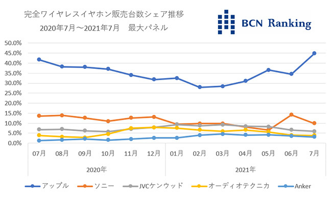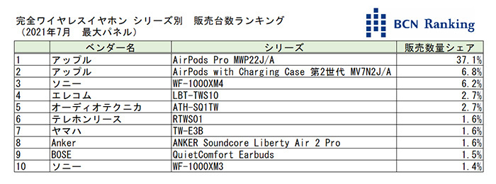 全国の家電量販店やECショップでPOSデータを集計する「BCNランキング」によると、2021年7月の完全ワイヤレスイヤホンの販売台数は、前年同月比118.1%と2桁増となった。前月はマイナス(84.8%)に転じたアップルの販売台数は128.3%と息を吹き返し、市場全体の数字を押し上げた。