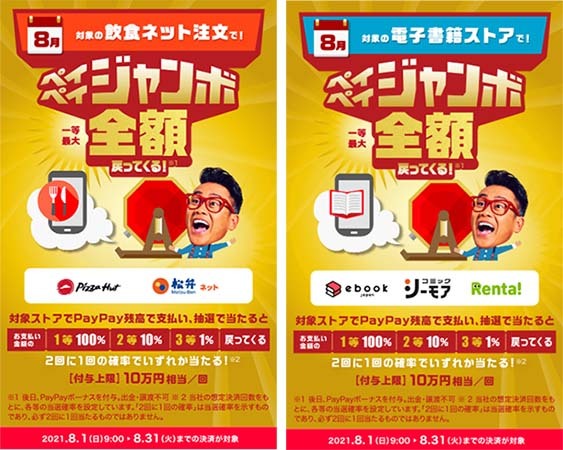 「飲食ネット注文」の対象店舗はピザハットオンラインと松弁ネット、「電子書籍ストア」ではebookjapan、コミックシーモア、Renta!。どちらのキャンペーンもくじの内訳は、1等が100%、2等が10%、3等が1%。還元上限は10万円相当/回。当選確率は2回に1回。期間は8月31日までとなっている。秋は読書を楽しみたいという人は買いだめするチャンスだ。