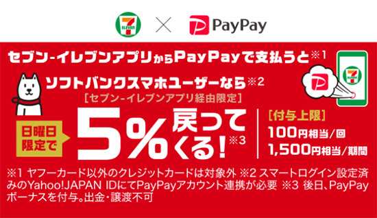 9月中旬まで継続して実施されるのが、ソフトバンクユーザーのみを対象とした「ソフトバンクユーザー限定!日曜日はセブン-イレブンアプリでおトクキャンペーン」。こちらはソフトバンクのスマホユーザーであれば、日曜日にセブン-イレブンアプリによる決済で5%を還元する。還元上限は100円相当/回、1500円/期間。9月12日まで。