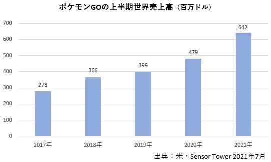 20年初頭から世界に広がった新型コロナウイルス感染症にともなう外出自粛を求める動きは、外を歩き回ってポケモンを捕まえる、というコンセプトのポケGOにとっては逆風だったはずだ。しかし、今年の上半期は、6億4000万ドルを売り上げ、昨年の上半期比で34%増、2017年上半期比では130%増を記録。勢いよく売り上げを拡大させている。上半期の売り上げ推移をみると、昨年は例年通りの伸びを示しつつ、今年の伸び率が最も大きかった。その要因は、ゲームを運営するナイアンティックが昨年7月に導入した「リモートレイドパス」にあるといわれている。