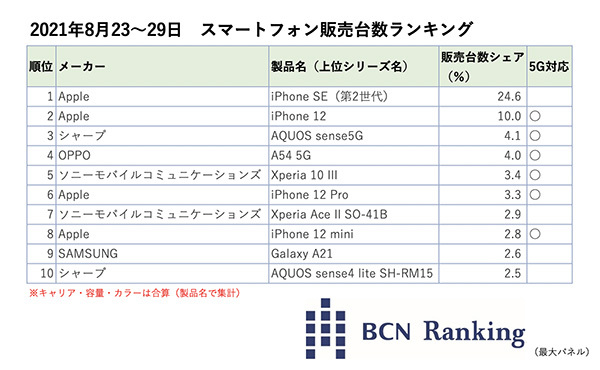家電量販店の実売データを集計した「BCNランキング」によると、直近の8月第4週(2021年8月23~29日)のスマートフォンのシリーズ別販売台数ランキングで、iPhone SE(第2世代)はシェア24.6%を占め、1位を獲得。2位には「iPhone 12」が続く。1位と2位のシェアは10ポイント以上も開き、おおむね価格が要因とはいえ、iPhone SE(第2世代)の人気がうかがえる。なお、確認した店舗では、1円などの特価は、8月31日までの期間限定と案内されていた。
