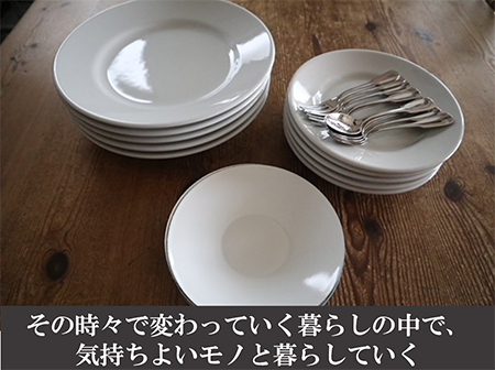 シンプルでありながら縁に丸みがあって持った時にとても心地よいイタリアの業務用食器シリーズと、軽くて重ねても場所を取らないホーローのお皿。どちらもシンプルで飽きなのこないデザインがいい。