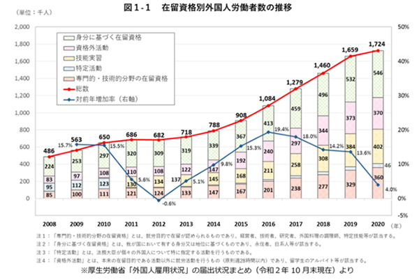 近年、企業のグローバル化やダイバーシティの広がり、もしくは人手不足解消の方策として外国人労働者の採用は増加傾向にある。厚生労働省が2008年から発表している「外国人雇用状況の届出状況について」においてもその傾向は見て取れ、2020年10月時点での外国人労働者数は172万4000人に達している。