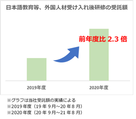 新たな外国人採用では採用基準を引き上げればある程度問題を解消できるかもしれないが、既存の外国人従業員については課題が残る。現在、そういった既存外国人従業員に対する教育のニーズも高まっているとか。オリジネーターでは、日本語教育といった外国人材受け入れ後の研修サービスも展開しているが、その受託額が2019年度から2020年度(2019年9月~2020年8月)にかけて2.3倍にふくれあがっている。