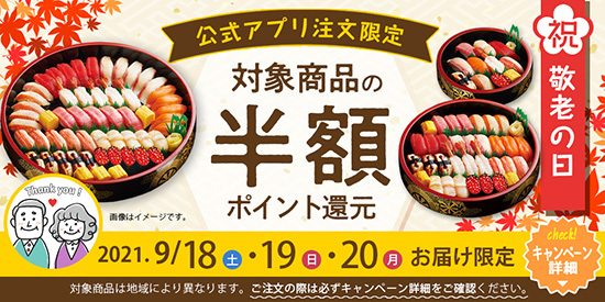 ライドオンエクスプレスホールディングスは、グループ企業の宅配寿司「銀のさら」で、敬老の日を含む2021年9月18日~20日の3日間に限り、公式アプリから対象商品を注文するとデリポイントを「半額分」還元する特別キャンペーンを実施する。