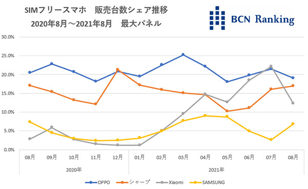 メーカーシェアでは前月にXiaomiが市場参入以来、初めてとなる月間シェアNo.1を獲得したが、8月は競合が巻き返した。OPPOが19.0%でトップ、シャープが16.9%で2位につける。