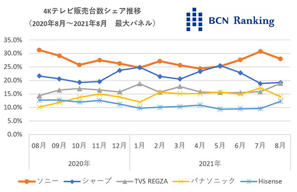 全国の家電量販店やECショップでPOSデータを集計する「BCNランキング」によると、2021年8月の4K対応液晶テレビ(4Kテレビ、有機ELテレビは含まない)の販売台数は前年同月比90.4%にとどまった。東京五輪が閉幕した影響もあり、前年の販売実績をやや下回った。