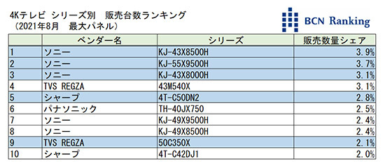 シリーズ別の販売台数ランキングでは前月と同じくソニーがトップスリーを独占。トップは43V型の「KJ-43X8500H」だった。8月に好調だったTVS REGZAでは「43M540X」が4位にランクイン。シャープは「4T-C50DN2」、パナソニックは「TH-40JX750」が売れ筋となっている。(BCN・大蔵大輔)
