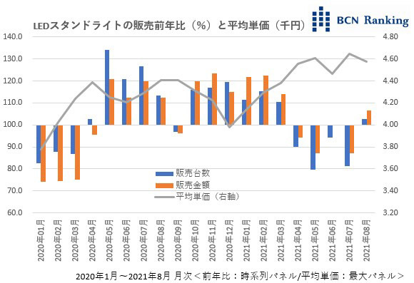 コロナ禍で売れに売れたWebカメラやPC、ディスプレイ。これら花形商品ほど派手ではないが、やっぱり売れたものがある。LEDスタンドライトだ。テレワークが一般的になり、家庭でも手元照明の重要性が増した。昨年5月以降売り上げが拡大。今年は4月以降、昨年の特需の反動減で、販売台数・金額とも前年比で2桁割れが続いたが、この8月、前年を上回るペースに戻した。