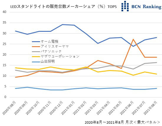 メーカー別では、3割前後の販売台数シェアを握るオーム電機がトップ。アイリスオーヤマ、パナソニック、ヤザワコーポレーション、ヤマダ照明と続く。トップシェアのオーム電機は平均単価が2500円前後と安価。室内照明や卓上の明るい照明に加え、補助的な照明ニーズもとらえている。続くアイリスオーヤマは、6月以降シェアを大きく伸ばした。ワイヤレス充電器付きで3000円台のモデルの売り上げがけん引。6月にはオーム電機を追い抜きトップシェアに立つ場面もあった。3位のパナソニックは平均単価が1万円前後とやや高価だが、デザインの良さや質感の高さで支持を集め徐々にシェアを上げている。(BCN・道越一郎)
