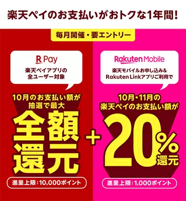 なお、10月4日~10月13日9時59分に実施する「楽天カードがおトクになる9日間!楽天ペイのお支払いで最大20%還元!」は楽天カードによる支払い限定だが、「1年間ずーっと!毎月全額還元抽選」は、楽天ペイアプリに設定して対象店舗で支払い可能なカードであれば支払い方法は問わない。