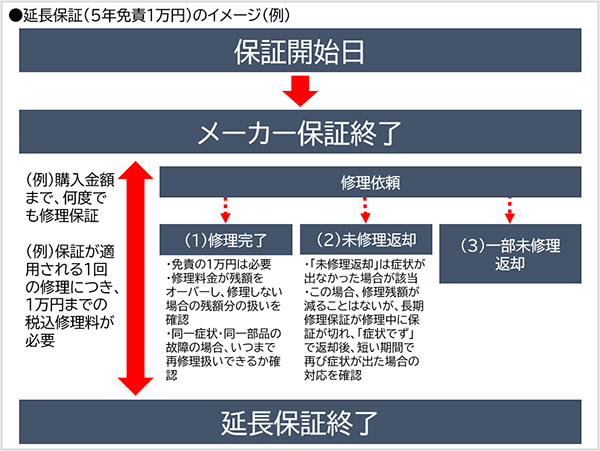 前者は免責の1万円が必要となり、修理料金が残額をオーバーして修理しない場合の残額分の扱いを確認すればいい。あるいは、同一症状・同一部品の故障の場合、いつまで再修理扱いできるかを確認しよう。