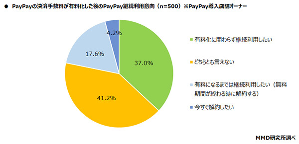 PayPay加盟店オーナーに、10月からPayPayの手数料が有料化した後もPayPayを継続利用したいか聞いたところ、「有料化に関わらず継続利用したい」が37.0%、「どちらとも言えない」が41.2%、「有料になるまでは継続利用したい(無料期間が終わる時に解約する)」が17.6%、「今すぐ解約したい」が4.2%となり、「有料になるまでは継続利用したい(無料期間が終わる時に解約する)」と「今すぐ解約したい」を合わせた解約意向は21.8%となった。
