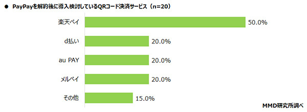 PayPayの手数料が有料化した後、PayPayを解約したい、または今すぐ解約したいと回答した109人を対象に、PayPay解約後に導入を検討するコード決済サービスがあるか聞いたところ、「他に導入を検討するコード決済がある」と18.3%が回答した。ほかに導入を検討するコード決済サービスがある20人に、どのコード決済サービスを導入したいか複数回答で聞いたところ、「楽天ペイ」が最も多く50.0%、次に「d払い」、「au PAY」、「メルペイ」が20.0%となった。