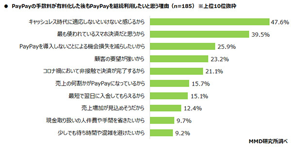 PayPayの手数料が有料化した後も継続利用したいと回答した185人を対象に、その理由を複数回答で聞いたところ、「キャッシュレス時代に適応しないといけないと感じるから」が最も多く47.6%、次に「最も使われているスマホ決済だと思うから」が39.5%、「PayPayを導入しないことによる機会損失を減らしたいから」が25.9%と続いた。