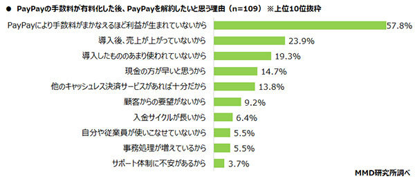 PayPayの手数料が有料化した後、PayPayを解約したい、または今すぐ解約したいと回答した109人を対象に、解約したいと思う理由を複数回答で聞いたところ、「PayPayにより手数料がまかなえるほど利益が生まれていないから」が最も多く57.8%、次に「導入後、売上が上がっていないから」が23.9%、「導入したもののあまり使われていないから」が19.3%となった。
