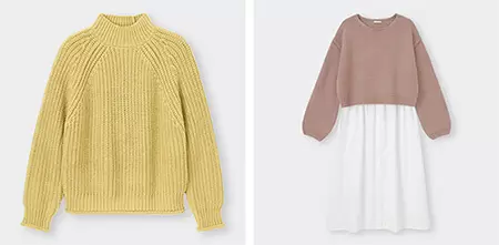 チャンキーニットは、ざっくりとした編地で1枚でスタイリングの主役になり、中条さん、ゆうたろうさん着用の「チャンキーニットハイネックセーター」は、ニットのボリューム感と華やかなカラーが存在感抜群。Charaさん着用の「チャンキーニットシャツコンビネーションワンピース」は、ニットとワンピースがセパレートになっているので、セットで着用しても、別々で着まわしても楽しめる。価格は1990円~2990円。