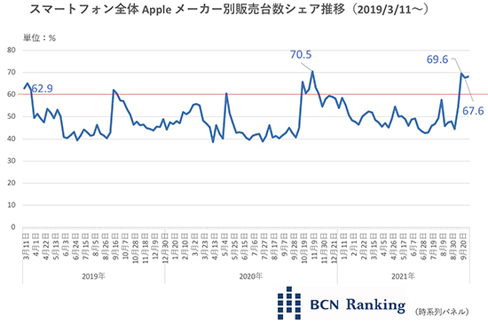 家電量販店の実売データを集計した「BCNランキング」によると、iPhone 13シリーズ発売日の2021年9月24日を含む9月第3週(21年9月20日~26日)、第4週(21年9月27日~10月3日)、10月1週(21年10月4日~10日)と3週連続で、スマートフォン全体に占めるAppleの販売台数シェアは6割を超えた。最も高い9月第3週で、シェアは69.6%を占めた。