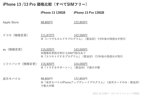 iPhone 13 128GBのAppleのオンラインショップ、主要家電量販店オンラインショップ、楽天モバイルでの販売価格は9万8800円。大手3キャリア(ドコモ・ソフトバンク・au)から機種変更で購入する場合の一括販売価格と比較すると、実は1万円以上安い。