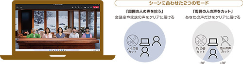 AIノイズキャンセリングは、オンライン会議で自分の声以外をノイズと見なして、通話相手に聞こえなくできる。家族やペットが近くにいる部屋で会議に参加せざるを得ず、会議に関係のない生活音や家族の声を、取引先や上司に聞かれたくないという人には大変重宝する機能だ。