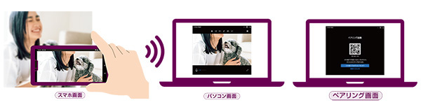 スマホカメラ転送は、スマホに専用アプリをインストールすることで、スマホのカメラ映像をPCのWebカメラとして認識、活用できるアプリケーションだ。PCのWebカメラとの切り替えは設定で簡単に行えるため、オンライン会議の最中に見せたい紙資料を映したり、屋外からその場の様子を映して報告するといったときに、ノートPCを抱えてWebカメラで映さなくて済む。