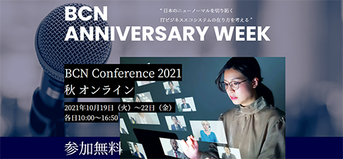 週刊BCNは10月19日、オンラインイベント「BCN Conference 2021 秋 オンライン」を開催している。ライブ配信スタイルのイベントで、「日本のニューノーマルを切り拓くITビジネスエコシステムの在り方を考える」を主要テーマとして、週刊BCNが創刊40周年の節目であることから規模を拡大。「BCN Anniversary Week」として、22日までの4日間にわたって開催される。テーマは、19日と20日、22日が「ニューノーマルな働き方を支えるソリューション」、21日が「ハイブリッドクラウド時代のITインフラストラクチャ」となっており、計27コマで講演や活発な議論が展開される。
