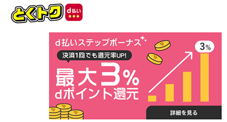 「d払いステップボーナス」とは、ドコモユーザー限定で開催されているキャンペーンであり、最大3%のdポイント還元が受けられる。これは、d払いのコード決済で毎月買い物をした回数に応じて、通常ポイントとは別にプログラムポイントが付与されるものであり、50回以上で次月のdポイント付与率が+1%となる。これに、基本還元率の0.5%、dカード支払いによる1%、ギガ補プラン契約による0.5%を合わせると、最大で還元率が3%になるという仕組みだ。エントリーが不要な上に、1回でも買い物をすれば+0.2%になるため、気がつかないうちにdポイントが貯まっていた、ということもあるかもしれない。