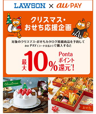 大手コンビニのローソンで、対象のクリスマスおよびおせちカタログ掲載商品を予約し、au PAYのコード支払いで購入するとPontaポイントが最大10%還元されるキャンペーンを開催している。ポイントは200円ごとに20ポイント、クリスマスとおせちの合計で最大1000Pontaポイントまで付与される。まだ10月であり気の早い感もあるが、早めに予約しておけば直前になって慌てることがないというメリットもある。また、期間は2022年1月3日までなので、じっくり検討してからでも間に合うのがありがたい。