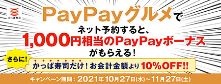 かっぱ寿司、「PayPayグルメ」の予約で最大1000円相当のPayPayボーナス!さらに会計10%OFF