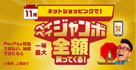 対象ストアでPayPay残高を使って支払いをすると、抽選で決済金額の最大100%が戻ってくる「9月・10月・11月は毎月おトク!秋のペイペイジャンボ(オンライン)」は、11月になって対象店舗が変更された。幅広いカテゴリのストアが揃っているので、ぜひ改めて確認しておくことをおすすめする。くじの内訳は1等が100%、2等が10%、3等が1%。付与上限は10万円相当/回・期間。