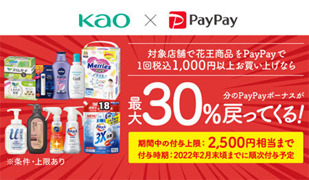 PayPayはすでに12月のキャンペーンも発表している。まずは「花王商品の購入で最大30%戻ってくるキャンペーン」。今回が第4弾となる人気企画で、対象店舗で花王商品を1000円以上購入すると30%が戻ってくる。付与上限は2500円相当。12月31日まで。