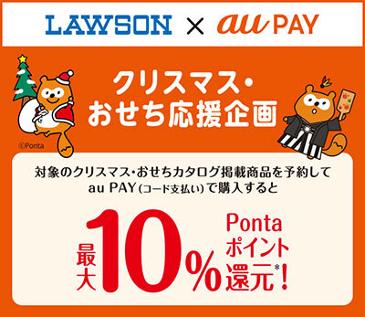 au PAYで注目したいのは、ローソンで実施しているクリスマス・おせちカタログの掲載商品が10%還元される「クリスマス・おせち応援企画」だ。さまざまな店舗が予約受付を開始しているが、少しでも安く購入したいなら、au PAY×ローソンの組み合わせはおすすめだ。期間は1月3日まで。