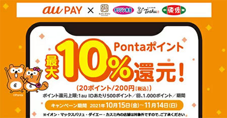 また、オリジン東秀が運営する「オリジン弁当」「キッチンオリジン」「れんげ食堂Toshu」「中華東秀」でも「au PAY決済でPontaポイント最大10%還元キャンペーン」が開催されている。200円以上au PAY決済すると10%還元する。ポイント還元上限は1au IDあたり500ポイント/回、1000ポイント/期間。11月14日まで。