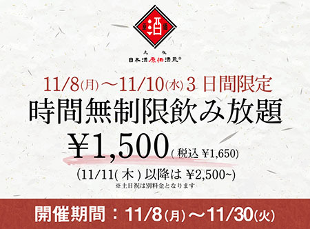 クリエイティブプレイスが運営する日本酒原価酒蔵は、全店舗で11月8日から10日の3日間限定特価1500円(税込1650円)で時間無制限飲み放題を開催する。11月11日から30日は2500円(税込2750円)、土日祝は1人プラス500円となる。