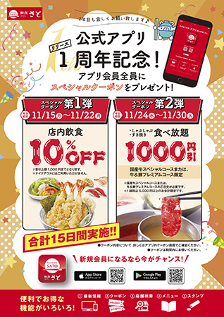 10%OFF&食べ放題1000円引クーポン配布中! 和食さとがアプリ1周年記念キャンペーン