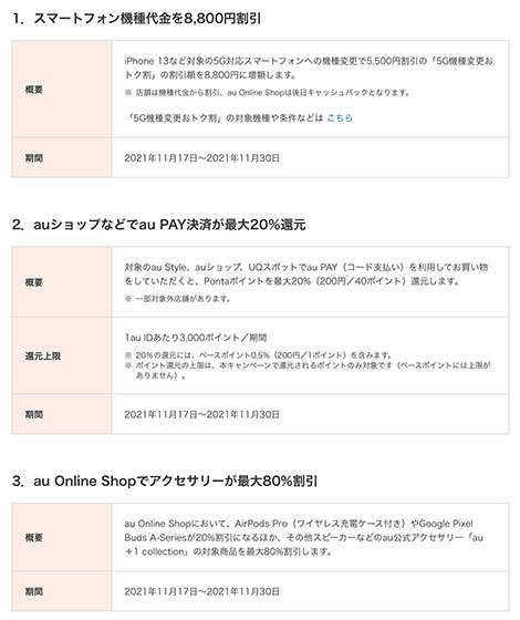 機種代金の割引では、「iPhone 13」など対象の5G対応スマートフォンへの機種変更に限り、通常5500円割引の「5G機種変更おトク割」の割引額を8800円(Xperia 1 III/Xperia 5 IIIは1万1000円)に増額し、店舗では割引、au Online Shopは後日、au PAY残高にキャッシュバックする。