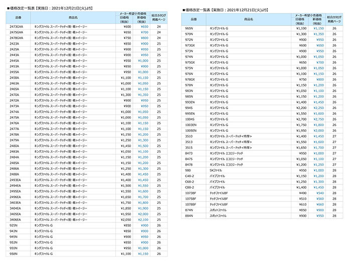 キングジムは、12月21日からファイル製品のメーカー希望小売価格を改定すると発表した。
