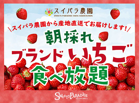 スイーツパラダイスでは、季節ごとに旬のフルーツを好きなだけ堪能できる食べ放題企画「フルーツパラダイス」を実施している。今回の朝採れブランドいちご食べ放題では、スイパラ農園組合に協力している農家から届く新鮮な苺を、食べ放題で提供する。