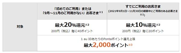 まずは還元率がユーザーのステータスによって変動する。「au PAYを初めて利用する、9月1日以降に利用していないユーザー」は20%、「9月1日~11月30日で利用したユーザー」は10%になる。