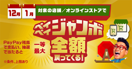 「毎月どこかで当たる!ペイペイジャンボ12月」はリアルとネットの指定された店舗が対象となる。リアルではハードオフ系列の店舗やグッデイ、名鉄百貨店、リバーウォーク北九州と少なめだが、ネットではヤフーのサービス、コミックシーモアなどのエンタメ系、マツモトキヨシオンラインストアなどのコスメ系と使えるシーンは多い。期間は1月10日まで。